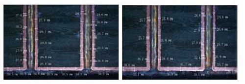 測(cè)試板成品量測(cè)所有電阻均合格,說明板電銅厚控制21+/-3um、成品銅厚控制均值35um到40多um,線寬控制在0.19到0.21之間,成品電阻合格。且蝕刻后的半成品電阻比成品的電阻大1.5Ω左右。故蝕刻量測(cè)電阻理論上應(yīng)做1.5Ω的預(yù)大。預(yù)大與PCB的設(shè)計(jì)和阻焊和表面處理流程帶來的差異有相當(dāng)大的關(guān)系,不同PCB蝕刻后的電阻預(yù)大需要考慮到這些因素。