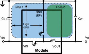 在規劃電源布局時,首先要考慮的是兩個開關電流環路的物理環路區域。雖然在電源模塊中這些環路區域基本看不見,但是了解這兩個環路各自的電流路徑仍很重要,因為它們會延至模塊以外。在圖1所示的環路1中,電流自導通的輸入旁路電容器(Cin1),在高端MOSFET的持續導通時間內經該MOSFET,到達內部電感器和輸出旁路電容器(CO1),后返回輸入旁路電容器。
