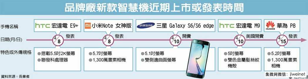 本周起宏達(dá)電HTC One M9、E9+,以及三星新機Galaxy S6/S6 edge上市,加上8日小米歡慶米粉節(jié),以及15日華為發(fā)表新機P8,大立光、聯(lián)發(fā)科等相關(guān)供應(yīng)鏈忙出貨,擺脫傳統(tǒng)淡季的“五窮”魔咒。