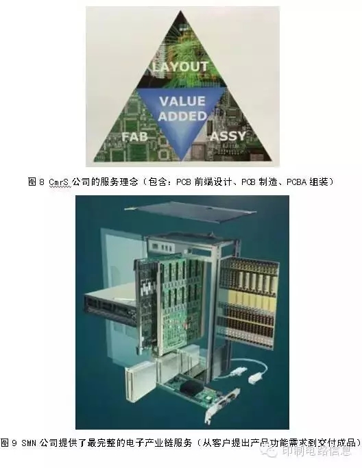 美PCB的核心競爭力之五在于其上、下游的整合能力以及向客戶提供一站式的服務能力,更突出其對于新產品研發的“快”之要求。大多數的美PCB工廠麻雀雖小、五臟俱全,有客戶的設計過程就已經一起做了大量的溝通甚至參與或主導了設計工作之本身,故對于產品的特點了如指掌,生產起來自然也順利。一站式服務的內容包括方案設計、信號完整性設計、PCB前端設計、PCB制造、PCBA組裝、裝配、測試等及相關工作。不同規模的公司,所提供服務的完整度和深度也各不相同,如圖8~圖10。 當然,這些公司在大批量生產階段是無法參與的,在后階段的PCB大批量生產則轉到了中。