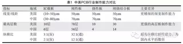 美PCB的核心競爭力之一在于其較強的制作能力,以表1從線寬線距、高層數、縱橫比等幾個指標解析兩內PCB工廠的能力。