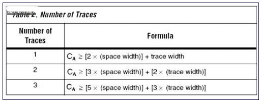 兩個過孔之間的區(qū)域被稱為走線通道。相鄰過孔焊盤之間的通道面積是信號布線必須經(jīng)過的小面積。表1用來計算可以經(jīng)過這個區(qū)域布線的走線數(shù)量。