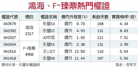 蘋果新機(jī)上市加持等利多浮現(xiàn),永豐金證衍商部指出,鴻家軍中的鴻海(2317)及F-臻鼎(4958)熱門認(rèn)購權(quán)證很夯。