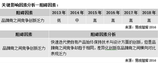 阻礙智能手機(jī)市場(chǎng)發(fā)展的因素其中之一是智能手機(jī)市場(chǎng)本身產(chǎn)品已缺乏新意,目前為了應(yīng)對(duì)市場(chǎng)競(jìng)爭(zhēng),各家廠商的產(chǎn)品更新周期都在縮短,快速迭代雖然在同一品牌內(nèi)能帶來技術(shù)提升,但是品牌之間橫向比較很難見到差異化創(chuàng)新,導(dǎo)致硬件產(chǎn)品之間競(jìng)爭(zhēng)趨同。