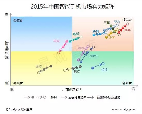 目前智能手機(jī)已進(jìn)入到產(chǎn)業(yè)發(fā)展的成熟期,市場(chǎng)品牌格局相對(duì)穩(wěn)定,2015年整體智能手機(jī)市場(chǎng)超過80%的是產(chǎn)手機(jī),2015年智能手機(jī)市場(chǎng)雖然銷量仍保持增長,但是增速明顯下降。