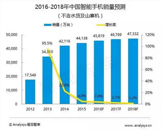 根據(jù)Analysy易觀智庫數(shù)據(jù)顯示,預(yù)計(jì)2016年中智能手機(jī)銷量將達(dá)到4.41億,較2015年增長3.8%。預(yù)計(jì)2018年中智能手機(jī)銷量將在4.73億左右,整體增長速率呈現(xiàn)出下降趨勢(shì)。