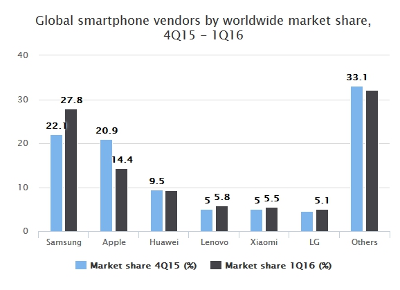 TrendForce公司稱,蘋果在全球手機(jī)市場上所占的份額從2015年四季度的20.9%下跌到了2016年一季度的14.4%;而它的競爭對(duì)手三星,得益于其Galaxy S7和Galaxy S7 Edge手機(jī)的強(qiáng)勁銷售態(tài)勢,其市場份額從22.1%增長到了27.8%。