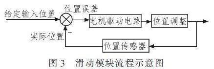 如圖3滑動模塊流程示意圖所示,本系統(tǒng)方案設(shè)計在傳輸系統(tǒng)和smt生產(chǎn)設(shè)備的連接處,增設(shè)一個滑動裝置,主要由滑動板、滾珠和位置傳感器組成,形成了一個閉環(huán)控制,起到平衡作用。在生產(chǎn)過程中,由模塊裝置上的位置傳感器實時將實際位置信號反饋給系統(tǒng),與給定輸入位置信號相比較產(chǎn)生一個位置誤差信號,然后由這個誤差信號驅(qū)動電機(jī)運(yùn)轉(zhuǎn)進(jìn)行位置調(diào)整。當(dāng)設(shè)備平衡時,位置誤差為零,不進(jìn)行位置調(diào)整;當(dāng)傳輸機(jī)有偏斜時,位置誤差不為零,由它驅(qū)動電機(jī)運(yùn)轉(zhuǎn),使設(shè)備進(jìn)行一定的位置調(diào)整。通過這套裝置,消除由振動產(chǎn)生位置偏移、利于整個生產(chǎn)線的生產(chǎn)、增強(qiáng)各設(shè)備之間銜接。