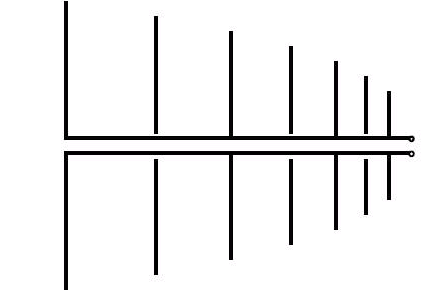 長(zhǎng)度漸增的雙極天線組可被普通的饋線饋給,產(chǎn)生一種數(shù)組天線,稱為「對(duì)數(shù)周期雙極數(shù)組(log periodic dipole array;LPDA)」,它具有寬帶的特性。典型的電視天線是對(duì)數(shù)周期的,它利用每一雙極天線之基本的和三共振諧波來(lái)涵蓋VHF電視頻道的全部范圍。一個(gè)典型的「對(duì)數(shù)周期雙極數(shù)組天線」如下圖所示: