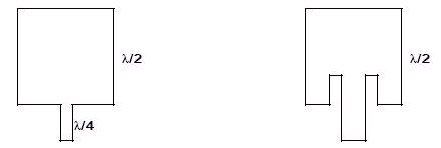 有許多方法可以達(dá)到饋線與阻抗匹配。補(bǔ)片可與一個(gè)四分之一波長(zhǎng)的高阻抗線匹配,或一條50奧姆線可延伸到補(bǔ)片的內(nèi)部,如下圖所示。阻抗在中心點(diǎn)是小的,且阻抗值是跟著軸長(zhǎng)的增加而增加,所以尺寸的選擇是以能得到支持50奧姆的點(diǎn)來(lái)決定的。