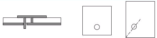 另一種饋線匹配法是將一同軸線的中心導(dǎo)體透過(guò)介電質(zhì),在適當(dāng)?shù)淖杩裹c(diǎn)接觸到補(bǔ)片的底部。補(bǔ)片的中心是經(jīng)過(guò)此結(jié)構(gòu)中的一個(gè)過(guò)孔(via)接地的,如下方的左圖與中圖所示。