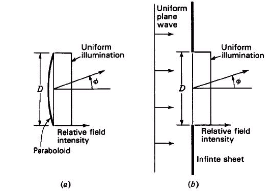 這是假設(shè)孔徑的照射度是平均分布的(uniform)。更精確地說(shuō),遠(yuǎn)場(chǎng)場(chǎng)型是分布在孔徑各處的電場(chǎng)之傅立葉變換,并且考慮到孔徑平面各處之振幅及相位的變動(dòng)。