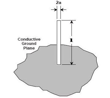 雙極的一半,一個(gè)四分之一波長(zhǎng)單極天線具有輻射電阻R = 36奧姆,可在「半無(wú)限導(dǎo)電接地面(semi-infinite conducting ground plane)」上運(yùn)作,如下圖所示。