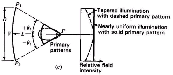 上圖顯示了在設(shè)計(jì)拋物面天線時(shí),所需面對(duì)的取舍問(wèn)題:弧面對(duì)應(yīng)的夾角和饋線的指向性。如果給定一個(gè)直徑與焦距長(zhǎng)度,對(duì)弧面直徑D所對(duì)應(yīng)的夾角而言,此饋線場(chǎng)型太寬了,將造成能量大量溢出,導(dǎo)致增益減少且天線溫度增高。反之,如果所對(duì)應(yīng)的夾角大于饋線的「半功率波束寬度(Half Power Beam Width;HPBW)」,將會(huì)導(dǎo)致照射度不一致,且在邊緣部位會(huì)逐漸減弱,并伴隨著輻射效益與增益的損失。
