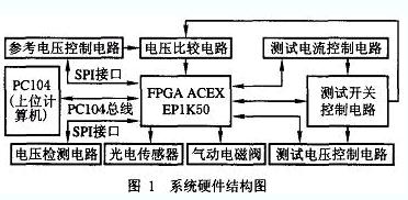 本系統以一臺PC104 為上位計算機,以FPGA為核心,通過PC104 總線實現上位機對測試的控制。測試系統總體框圖如圖1所示。