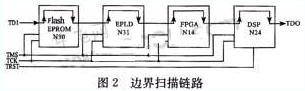 在此目標(biāo)板上,我們將Flash EPROM(N30)、DSP(N31)、EPLD(N14)和FPGA(N24)依次連接起來(lái),成為一個(gè)完整的掃描鏈路。TAP控制信號(hào)(TCK、TMS、TRST*)并聯(lián),前一器件的TDO和后一器件的TDI依次連接成鏈。其中只有DSP有TRST*信號(hào)。對(duì)于TRST*信號(hào),因?yàn)樗堑碗娖接行В粼谄骷?nèi)部或者電路板上已經(jīng)上拉,則在測(cè)試時(shí)可以不加以控制。而在該目標(biāo)板的DSP內(nèi)部此引腳處于下拉狀態(tài),為使其進(jìn)人邊界掃描狀態(tài),必須外加激勵(lì)信號(hào),因此本文把它單獨(dú)引出來(lái)。如圖2所示。