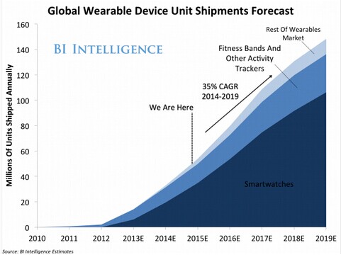 BI報告指出,穿戴設備未來幾年將迎來高增長期。預計在未來五年之內,全球穿戴設備的復合增長率將高達35%,到2019年的年銷量將達到近1.5億部。
