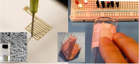 想要搞明白Hu教授研發的電路打印系統如何運作,簡單的方式就是拿噴墨式打印機來類比,但是從油墨盒噴出來的卻是液體金屬。Hu教授和他的團隊在測試了三十多種不同材質的紙張后,才明白到標準的噴墨打印紙和其他任何紙張同樣有效,而且相對來說也便宜。另一方面,他們所使用的金屬也普通不過了。“我們利用銀塊來制作納米線,”Hu教授說。“相比制作電子線路的‘常態’方式,銀依然非常便宜,而且遠比銅耐用,因為銅很容易氧化。”Hu教授和他的團隊有能力把紙一樣薄的電路折疊5,000次,而絲毫不損壞其很高程度的功能性,也不用擔心制成品的耐用性。