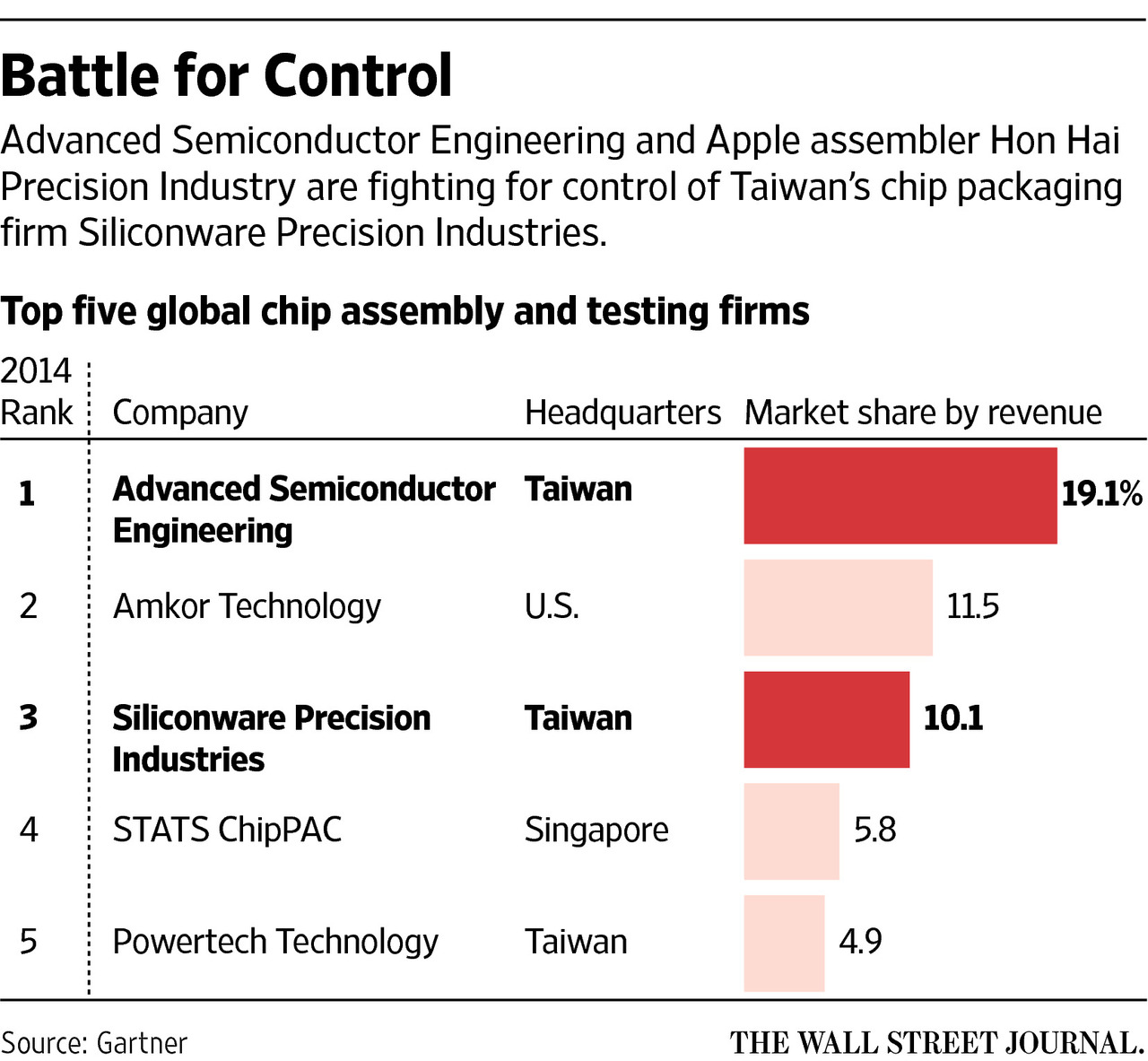 臺灣的日月光半導(dǎo)體制造股份有限公司(Advanced Semiconductor Engineering,以下簡稱“日月光半導(dǎo)體”)在今年8月份宣布,將在一項價值10億美元的交易中,收購規(guī)模更小的本土競爭對手——矽品精密工業(yè)股份有限公司(Siliconware Precision Industries,以下簡稱“矽品精密”)的25%股份。