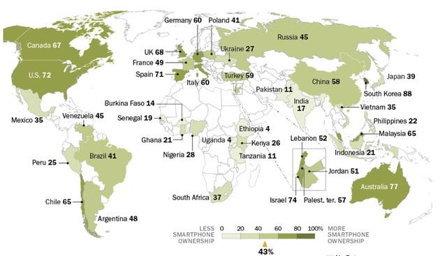 據(jù)美科技媒體Mashable近日引述皮尤機(jī)構(gòu)的一份報告稱,發(fā)展中家的智能手機(jī)普及率已經(jīng)增加到了37%。