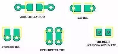 后一種方法在焊盤上直接打孔,寄生電感小,但是焊接是可能會出現問題,是否使用要看加工能力和方式。