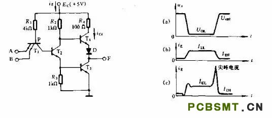 輸出級的T3、T4管短設計內同時導通。在與非門由輸出低電平轉向高電平的過程中,輸入電壓的負跳變在T2和T3的基極回路內產生很大的反向驅動電流,由于T3的飽和深度設計得比T2大,反向驅動電流將使T2首先脫離飽和而截止。T2截止后,其集電極電位上升,使T4導通。可是此時T3還未脫離飽和,因此在極短得設計內T3和T4將同時導通,從而產生很大的ic4,使電源電流形成尖峰電流。圖中的R4正是為了限制此尖峰電流而設計